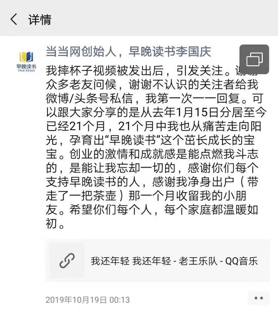 10月19日凌晨,李国庆在朋友圈对“摔杯事件”作出回应。他称:“从去年1月15日分居至今已经21个月,21个月中我也从痛苦走向阳光,孕育出‘早晚读书’这个成长的宝宝。创业的激情和成就感是能点燃我斗志的,是能让我忘却一切的,感谢你们每个支持早晚读书的人,感谢我净身出户(带走了一把茶壶)那一个月收留我的小朋友。”