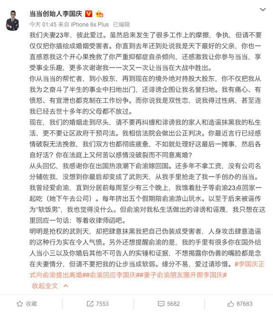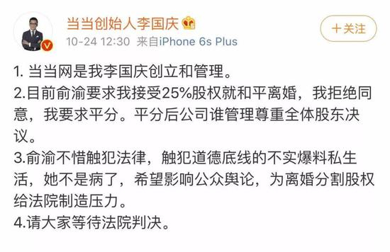 就在今天中午12时左右,李国庆又发微博表示,1. 当当网是我李国庆创立和管理。2.目前俞渝要求我接受25%股权就和平离婚,我拒绝同意,我要求平分。平分后公司谁管理尊重全体股东决议。3.俞渝不惜触犯法律,触犯道德底线的不实爆料私生活,她不是病了,希望影响公众舆论,为离婚分割股权给法院制造压力。4.请大家等待法院判决。