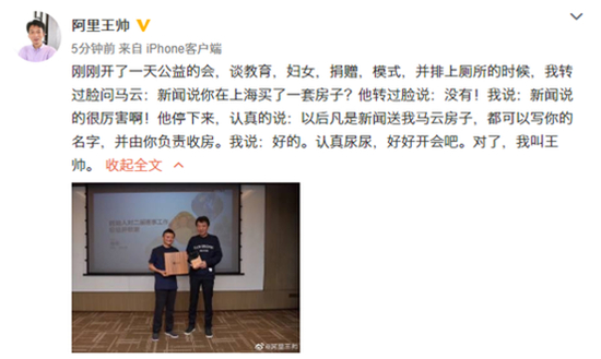 王帅回应全文:“刚刚开了一天公益的会,谈教育,妇女,捐赠,模式,并排上厕所的时候,我转过脸问马云:新闻说你在上海买了一套房子?他转过脸说:没有!我说:新闻说的很厉害啊!他停下来,认真的说:以后凡是新闻送我马云房子,都可以写你的名字,并由你负责收房。我说:好的。认真尿尿,好好开会吧。对了,我叫王帅。”