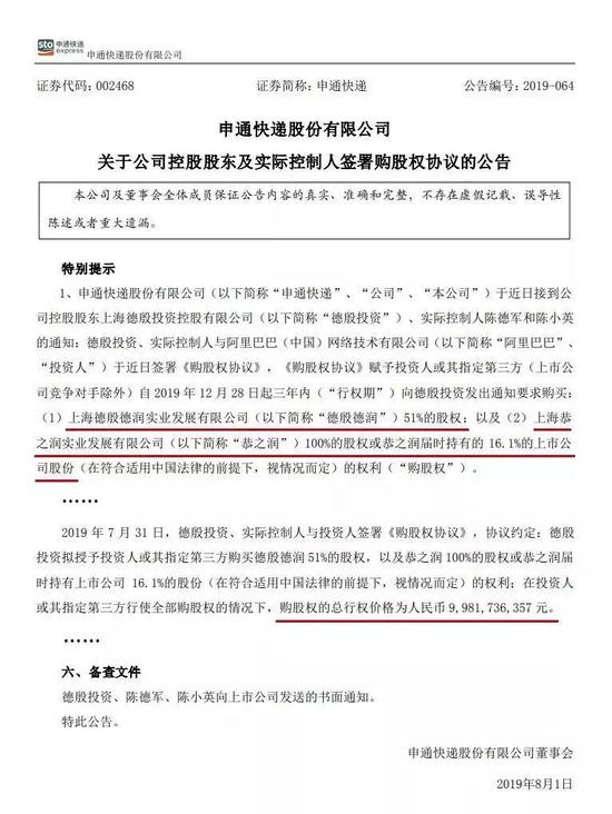 阿里巴巴宣布收购申通31.35%的股份,约定收购价为99.82亿人民币。