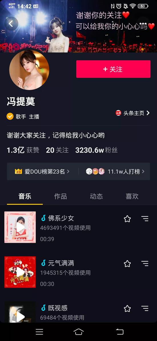 最初让冯提莫的《佛系少女》更出圈还有抖音的力量,这首歌曾经被誉为“抖音神曲”,可想而知抖音的曝光度都比一般平台要高,短视频的形式也更利于歌曲的传播。冯提莫在抖音的待遇也很好,如果和抖音合作,简直如虎添翼,抖音也可以借助冯提莫的影响力吸引更多新用户。毕竟冯提莫在华语歌手酷狗收听人数排行榜中坐拥2亿听众。