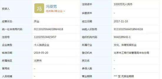 除了签约平台之外,盒饭财经(ID:daxiongfan)在企查查获知,冯提莫(冯亚男)于2017年11月注册了北京冯提莫文化工作室,并100%控股。