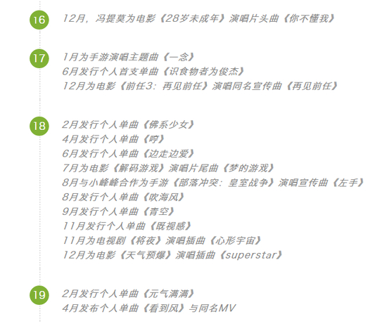 转型路上的冯提莫一点也不佛系,她试图撕掉网红女主播的标签的同时也试图撕掉翻唱歌手的标签。不停的发布原创单曲和为电影、手游演唱主题曲、插曲。