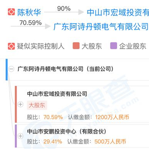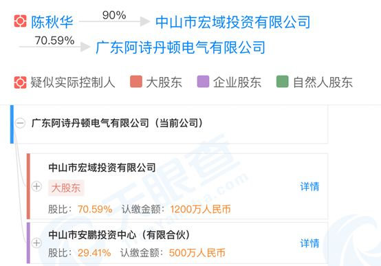 天眼查显示,广东阿诗丹顿电气有限公司于2003年8月15日成立,注册资本1700万元,法定代表人陈秋华,公司经营范围包括生产、销售、加工、研发:电气产品、橱柜、热水器,吸油烟机等。