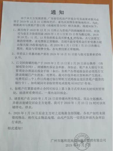 而紧邻广州市越和花鸟鱼艺大世界的艺和广场也在10月份收到通知,透露业主方将在2020年1月19日下午3时对全场停电、停水及进行地块围蔽,要求各位租户须将铺内所有物品全部搬离。对于签订商铺合同固定租期未到期的商户,在今年10月20日前签订终止合同协议,可享受2019年10月、11月份租金5折、12月份免租金和管理费的优惠。