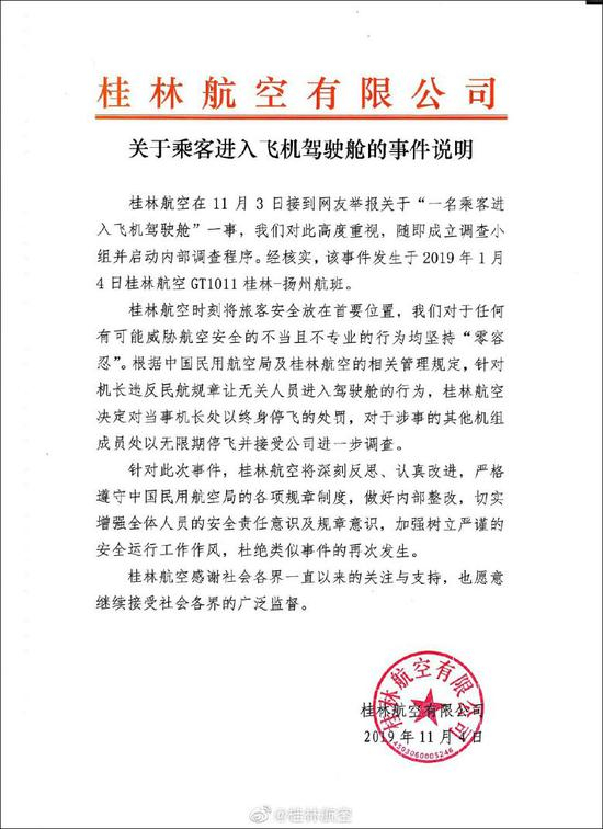 原以为几天后才会有通报,谁想第二天桂林航空(也是爆料后根据蛛丝马迹认为可能性最大的航司)就发布通告宣布对此事展开调查。调查通告发出来当天下午,桂林航空就发布了事件说明及处理结果:机长终身停飞。