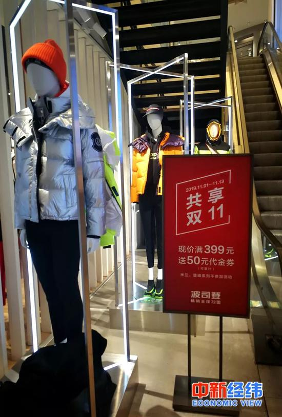 中新经纬记者注意到,加拿大鹅店内的羽绒服没有任何优惠活动,而波司登线下实体店内已开始“双十一”的促销优惠活动,“满399元送50元代金券”,但登峰等系列不参加活动。