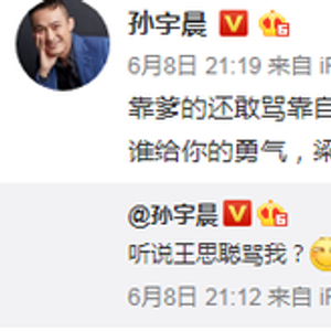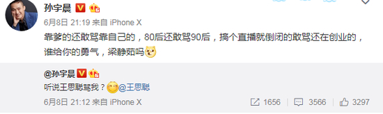 今年6月8日晚,孙宇晨发布微博称:听说王思聪骂我?几分钟之后,他又发微博:靠爹的还敢骂靠自己的,80后还敢骂90后,搞个直播就倒闭的敢骂还在创业的,谁给你的勇气,梁静茹吗?