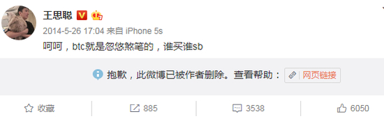 其实这并非二人首次交锋,五年前两人就比特币的问题相互对怼不断,火药味十足。2014年,王思聪在微博上发表了一篇评论,针对孙宇晨引以为傲的比特币,王思聪公开抨击比特币是完完全全的“忽悠”。