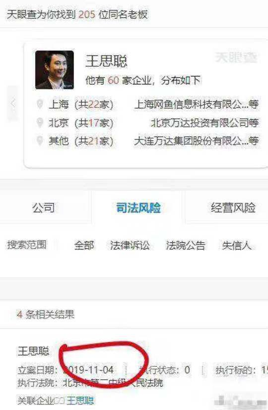 中国执行信息公开网发布的王思聪成为“被执行人”信息
