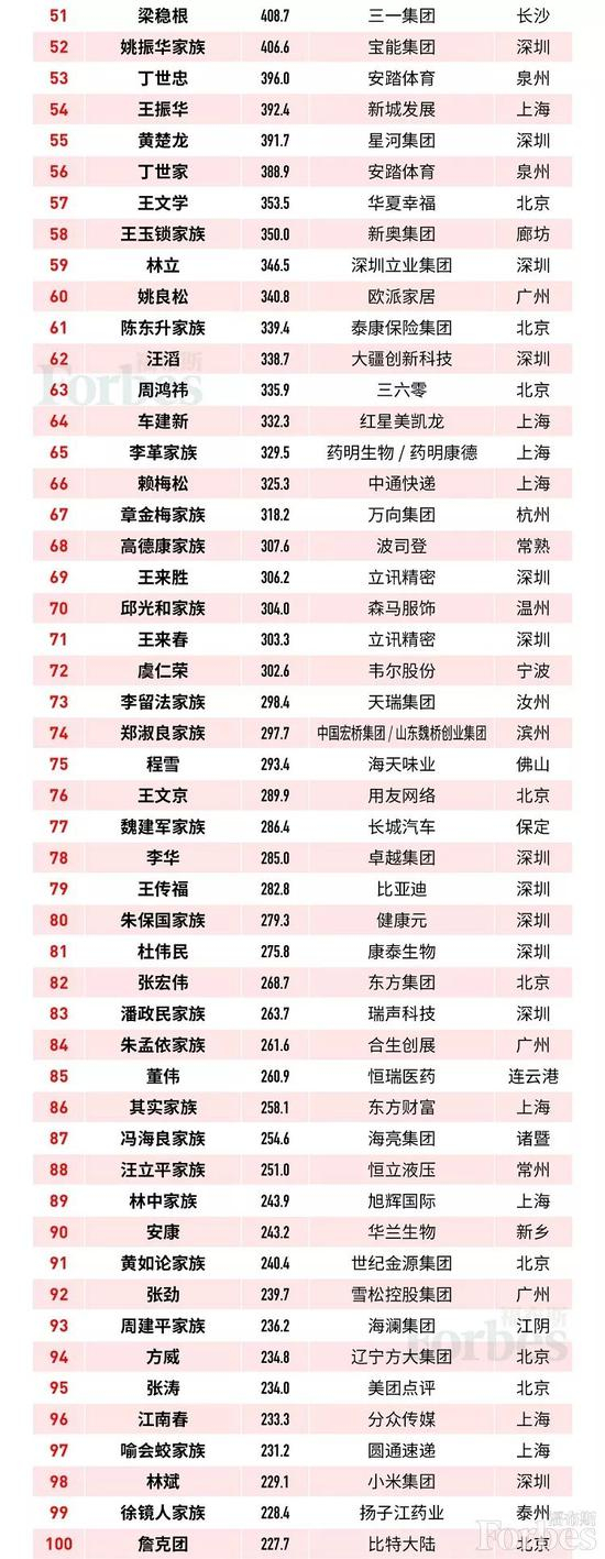 编制本榜单使用的持股和财务信息取自家族和个人、证交所、分析师和监管机构。资产计算使用的是截至10月25日的股价和汇率。非上市公司的估值基于对同类上市公司的分析评估。被抵押股权予以折价计算。与福布斯全球亿万富豪榜不同,福布斯中国富豪榜包括参与配偶生意的夫妇。一些估算还包括其他家族成员拥有的资产。