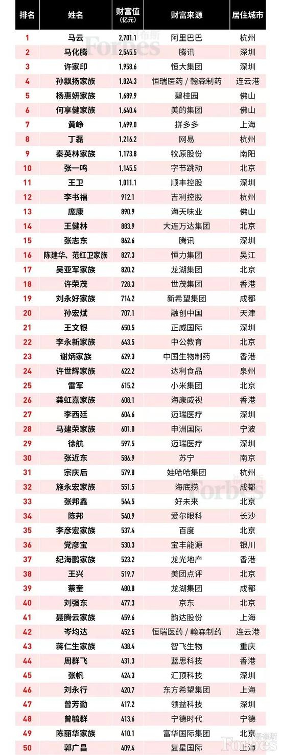 2019福布斯中国富豪榜:富豪总财富比一年前增长超1/5