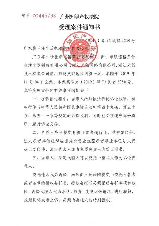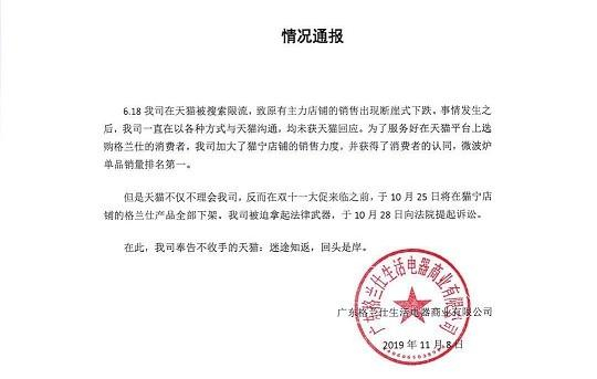 11月8日,针对被天猫限流、下架产品等问题,格兰仕方面确认,公司已于2019年10月28日向广州知识产权法院就天猫涉嫌滥用市场支配地位等相关事宜提起诉讼,并于2019年11月4日得到受理。