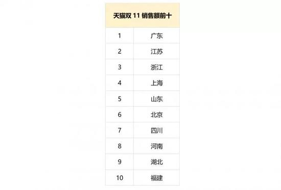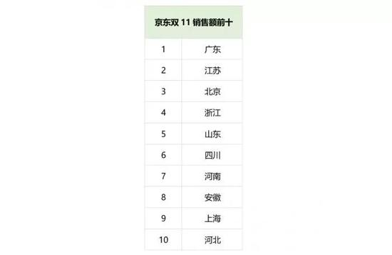 京东双11的数据显示,广东、江苏、北京、浙江、山东、四川、河南、安徽、上海、河北在销售额上名列前十。