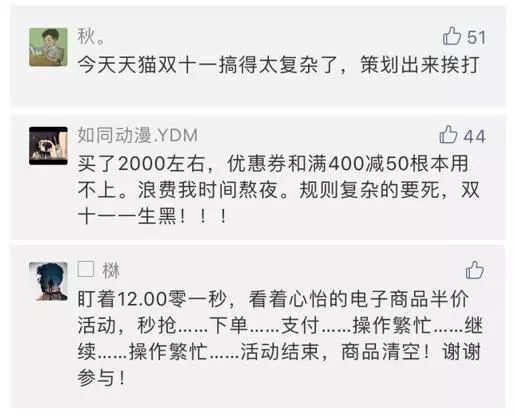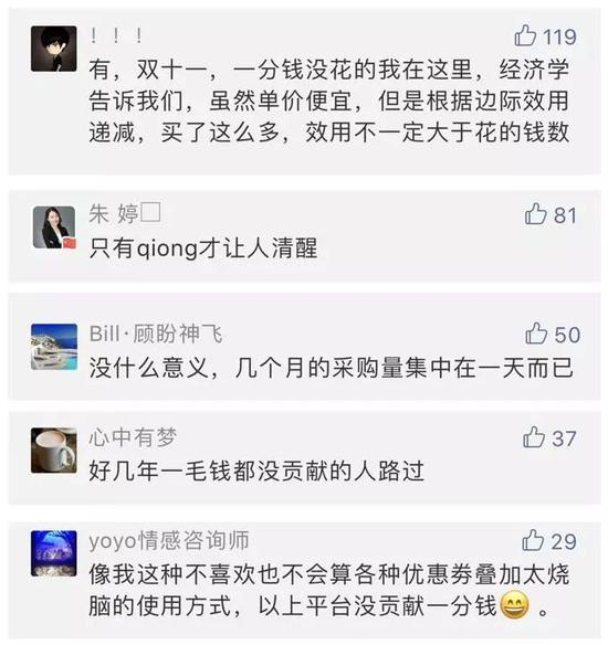 有部分网友留言表示“双11一分钱没花”,有人哭诉因为“太穷”,还有人认为优惠活动过于复杂: