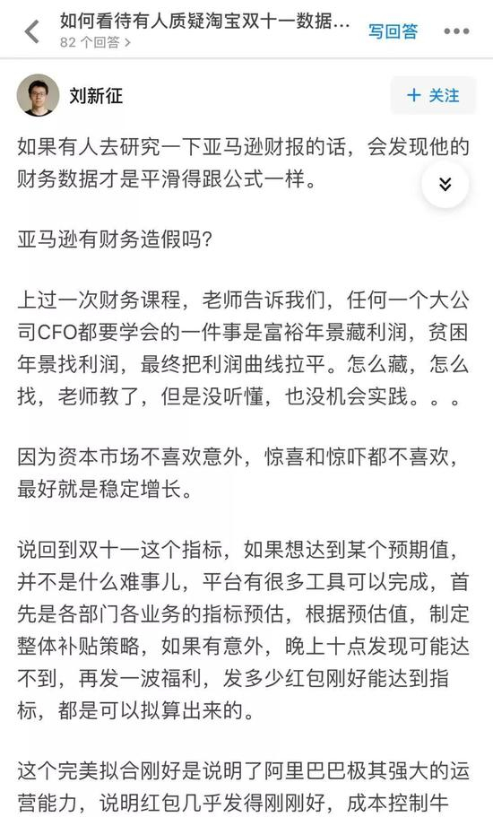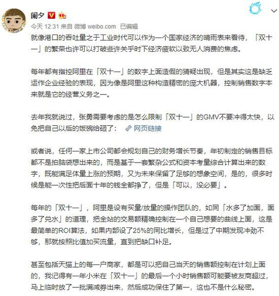 自媒体作者@阑夕 在微博对上述情况表示不认同,他表示天猫双11数据并没有造假,而是精确地控制了交易额,从而形成了理想的曲线。