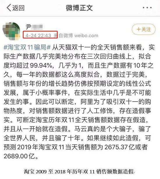 作者在微博中质疑,“如果继续如此造假,可预测2019年淘宝双11当天销售额为2675.37亿或者2689.00亿。”此预测数据与天猫昨天公布的总成交额2684亿元十分接近。