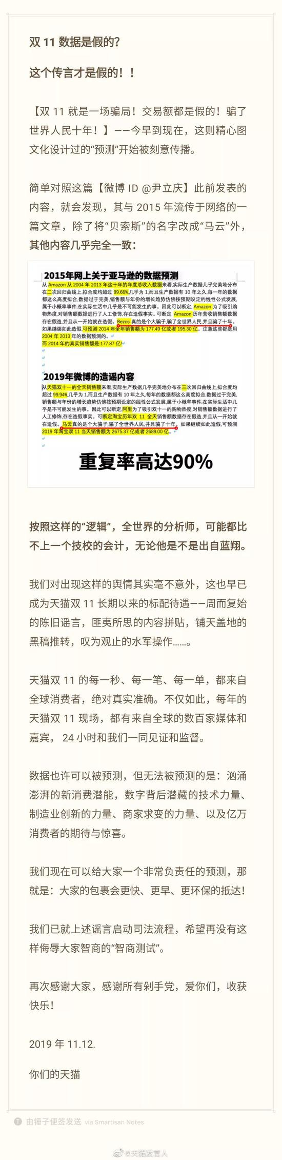11月13日消息,双十一后关于“天猫双11数据造假”的自媒体内容引发热议。昨天深夜,天猫发言人微博发布长文表示已就“双11数据是假的”谣言启动司法流程,希望再没有这样侮辱大家智商的“智商测试”。