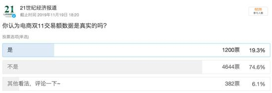 21君昨日在微博平台发起了投票,有近75%的读者选择了交易数据不真实。但根据评论,多数读者主要认为双十一的退货率高,需要统计退货了多少金额,才能展现出真实的数据原貌。