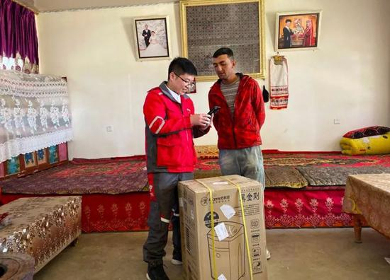 京东塔什库尔干营业部经理席海涛将一台洗衣机送到阿依迪江•阿力比亚提手中。