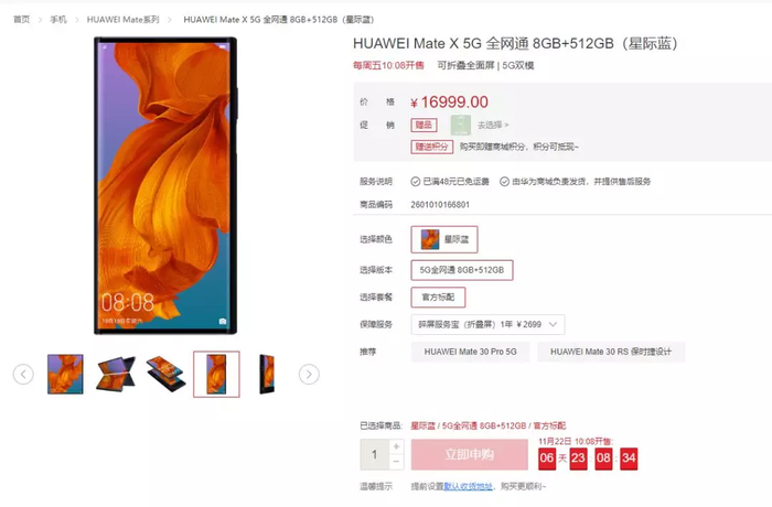 11月15日10时08分,华为Mate X在华为商城正式开售,官网的售价为16999元,产品刚刚上架就被抢光了。稍后,在电商平台上,华为Mate X被喊出了3万的售价。