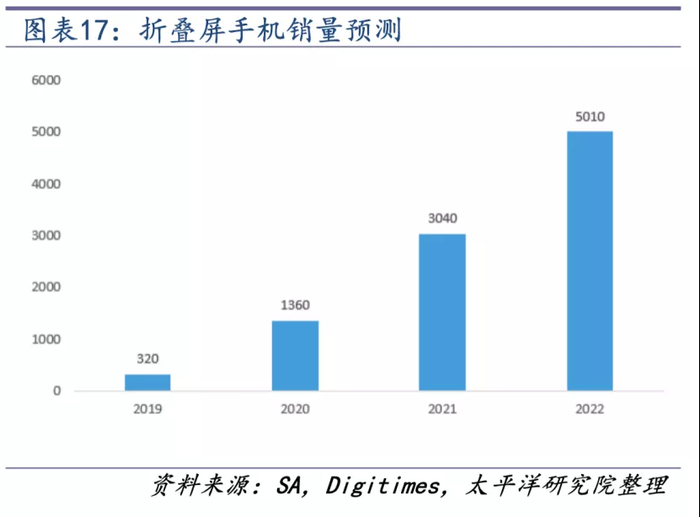 据太平洋证券研报,有机构预测到2022年随着良率和产能利用率的提升,价格有望下降到90美元,价格大幅下滑。基于对可折叠手机的成本、技术成熟度和规模效应,Digitimes预计到2022年折叠屏手机销量有望达到5010万台,在智能机市场中占比约3.4%。