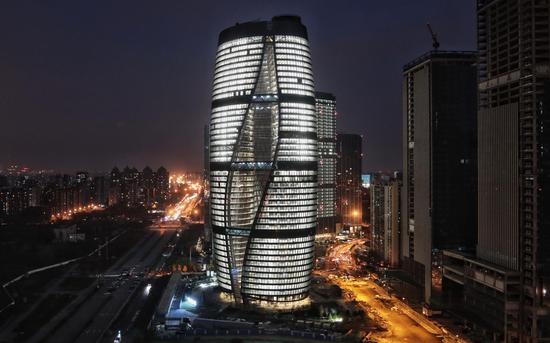 丽泽SOHO两个单塔的流线形反对称曲面盘旋而上,让人感觉犹如置身科幻大片之中。摄影/新京报记者 王嘉宁