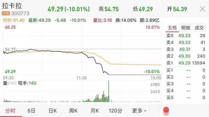 另外,从股价走势来看,拉卡拉股价在今年9月达到上市以来最高点后,一路下滑,从每股76.7元跌到目前的每股49.29元,跌幅达35.74%,市值蒸发超百亿。