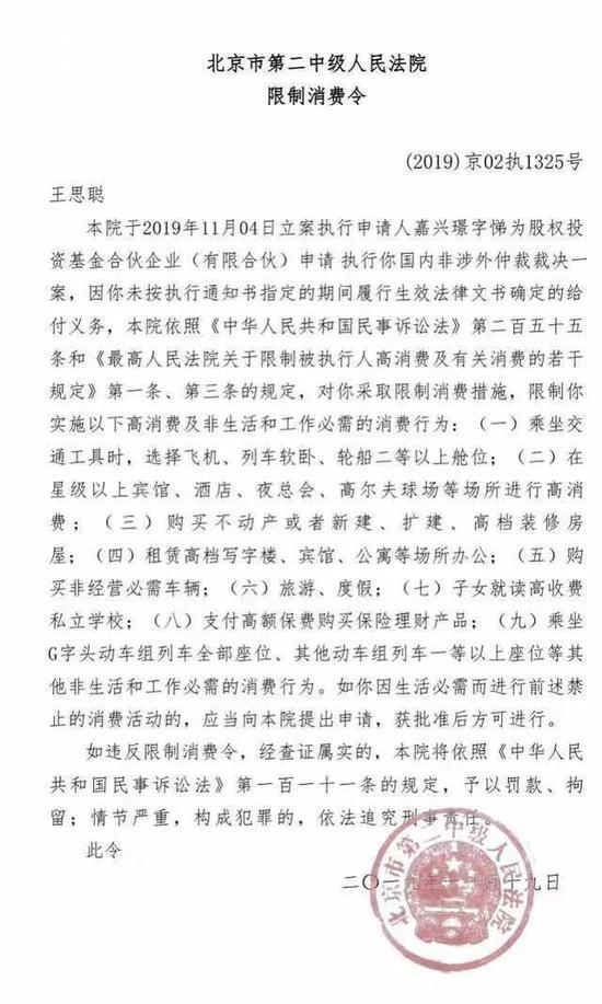 11月21日,王思聪被北京第二中级人民法院发布限制消费令。这是他今年第二次收到限制消费令。前一天,他才刚刚被上海嘉定法院解除限制消费令。