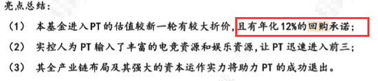 该产品材料显示,其中与王思聪有关的核心条款写道,“本基金确定转股后,PT公司承诺本基金取得不低于A轮投资人获得的所有权利,并由实际控制人王校长承诺本基金有权要求其回购股权”和“年化12%的回购承诺”。