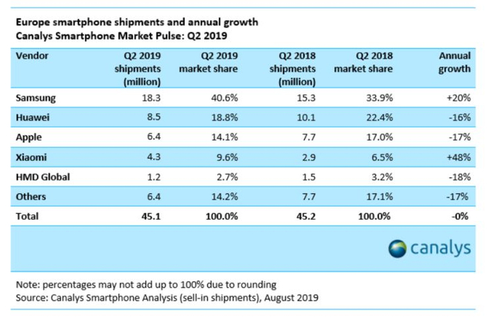 欧洲三季度手机销量:华为回暖 小米暴增73%
