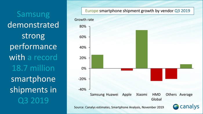 Canalys的这份榜单显示,欧洲超过亚太地区成为智能手机增长最快的地区,增长达到了8%。其中三星2019年三季度欧洲销量为1870万台,同比增长26%,这一结果确保其以35.7%的市场份额继续占据着欧洲出货量第一的宝座。