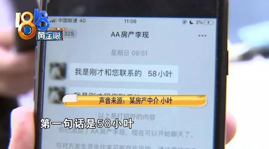 某房产中介 小叶:“(你的微信名字是AA房产李现,第一句话是58小叶,你到底是谁啊?)李现你不知道吗?那只是微信一个名字而已,我随便取啊(那你是姓叶吗?)对(那你为什么说自己是58的呀?)我在58发的房子啊(你到底是哪家公司的呀?)我这边是万科招商的,他没有光看我的房子,他也看别人的房子了,这边看完房子它那边平台都会记录的嘛,那边那些中介怎么拿到他的号码我也不知道。”