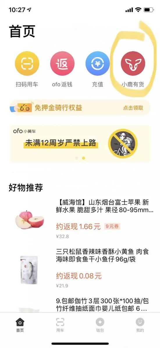 记者留意到,目前,ofo APP首页上线了小鹿有货,其中的商品标示着“金币+现金”的兑换价,但品类有限,选择余地小。