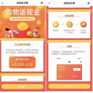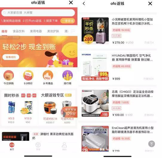 记者看到,“天天返钱”的界面与电商平台设置趋同,分为拼购、9.9元特价、头号爆品、限时秒杀,以及大额返现专区。不同的是,用户选择商品后即跳转至第三方电商平台或ofo旗下的小鹿有货,每件商品均标示出可返现金额。订单完成后,次月25日返现到账。返现金额累计达到一定额度后,可提现至微信/支付宝。