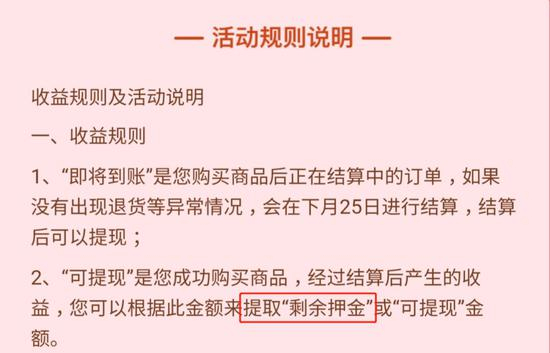 该活动收益规则及活动说明中写道,“可提现”是用户成功购买商品,经过结算后产生的收益,用户可以根据此金额来提取“剩余押金”或“可提现”金额。从ofo返钱上跳转到淘宝、京东拼多多等电商平台购买商品,用户可以获得返利。从ofo返钱平台获得的返利,每当达到20元时,即可提现20元。当订单支付完成10分钟后,即可在“领钱”页面的“即将到账”状态里查看订单和收益,在确认收货后的次月25号可以将返现金额提现。