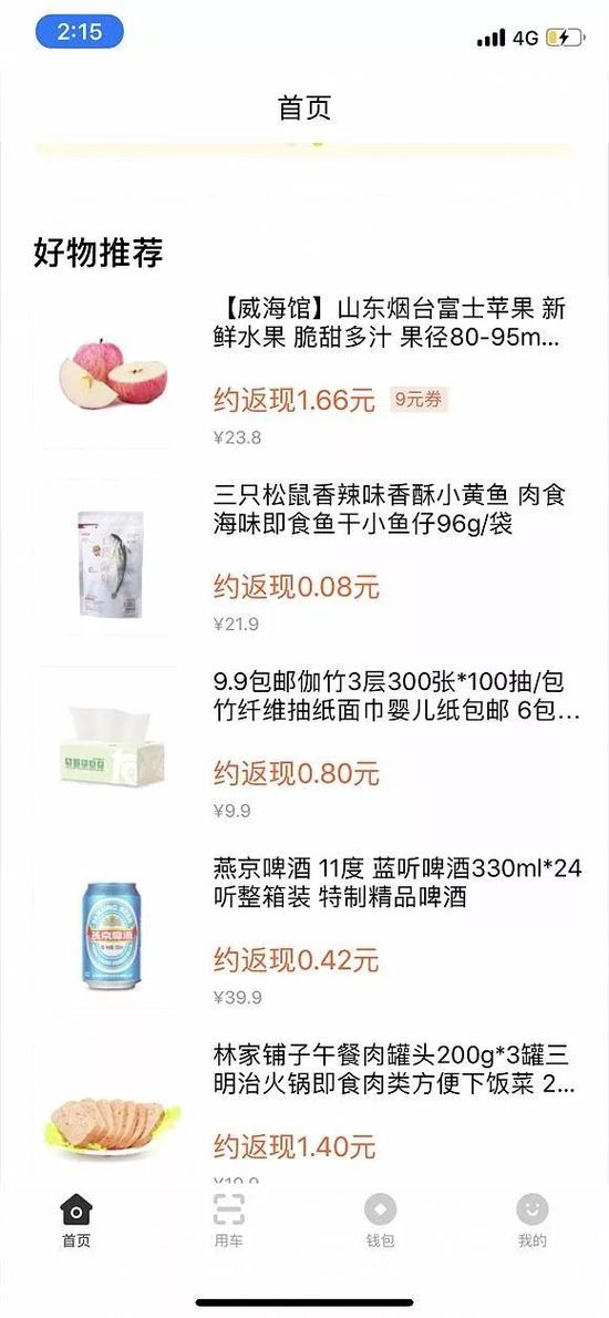 例如一箱售价39.9元的啤酒可以返现0.8元,一袋21.9元的零食可返现0.08元,136元的剃须刀仅可返现0.05元。商品售价与具体的返现金额之间并无直接的对应关系。