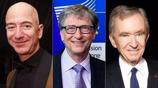 从左至右依次是:贝佐斯、盖茨、阿尔诺