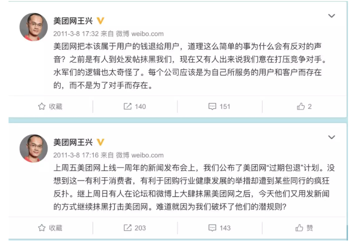 除了晒账户余额这一招,其实王兴的杀手锏,还在于高效的管理和综合运营效率。在对手纷纷砸广告的时候,美团的钱用于买百度关键词,同行启迪了用户的心智,王兴坐收渔翁之利。并冒天下之大不韪(同行的敌视),率先推出退款举动,以前的团购用户想要退款是极不容易的。王兴是这样设计的:当消费者被启迪心智知道了团购,想到的最好的服务商是美团。他的目的就达到了。