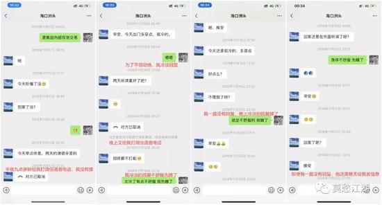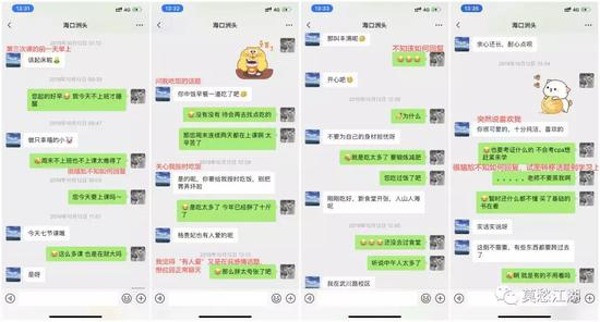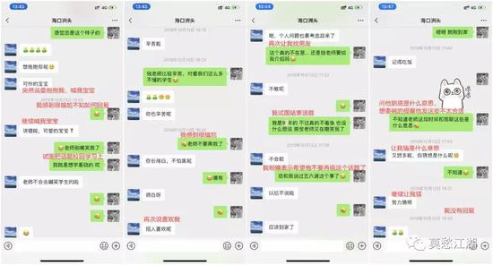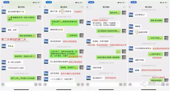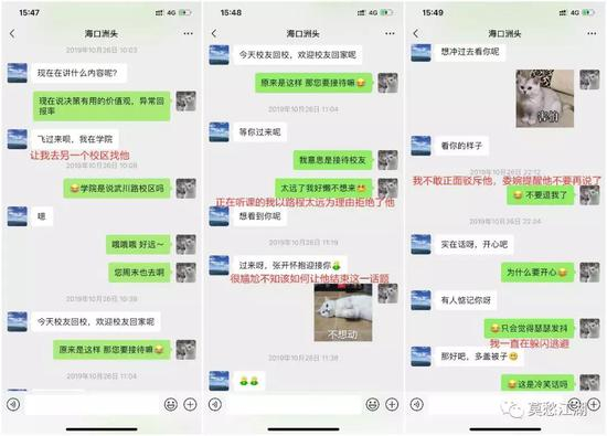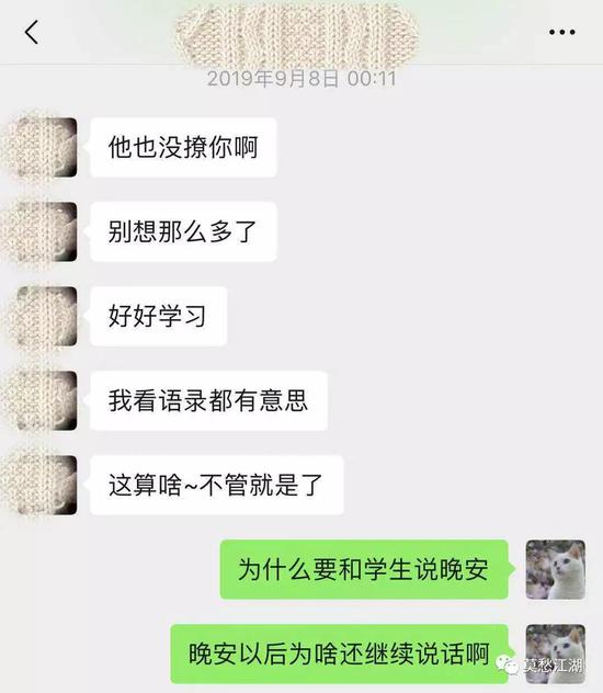 这些微信让我感到为难。一方面,我觉得这些聊天不太正常,不像是老师该和学生说的话,对学生“过于关心”。另一方面,我并不知道该如何回复是好,我能做的,就是少和他说话,或者勉强回复“老师您说笑了”“不要逗我了”“不要嘲笑我了”,再或者试图把对话拉回到学习上,婉拒他的要求,得到的回复却是“你很可爱”“喜欢”。