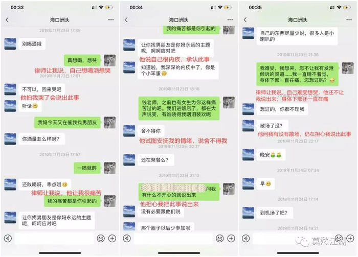 我告诉万律师,这件事情发生以后,他仍然坚持每天给我发微信,即使我后面已经不再回复。万律师随即指导我回复他的微信,提出“我的**(下体)还在痛,你的手指插入时,太粗暴。你都不管我说不要,就那么直接。”“我的痛苦都是你引起的。”他回复说“我深深内疚”、“舍不得你”“嗯,你调整一下”等。
