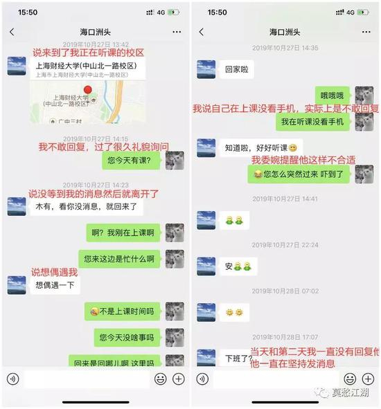 10月26日周六上午,我在中山北一路校区正常听课。钱教授发微信来邀请我去武川路校区见他,说“等你过来呢”“想看到你呢”“张开怀抱欢迎你”。又是一场尴尬时刻,正在听课的我以“路程太远”为理由拒绝了他。周日27号下午,他又说来了我在的中山北一路校区,给我发了定位,我不敢回复,隔了很久才礼貌的问他怎么来了,他回复说“想偶遇”我。