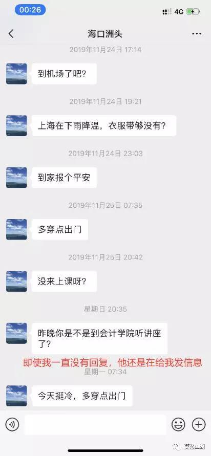 在接下来的两个月里,钱教授逐渐开始频繁地给我发微信,不过奇怪的是,他找我聊天,开始掺杂和学习无关的内容,比如:要我按时吃饭、多锻炼身体;告诉我他去打球了;问我会不会做饭,要来尝尝我做的饭;催我快点找男友,说我一个人在上海应该有人照顾等等。