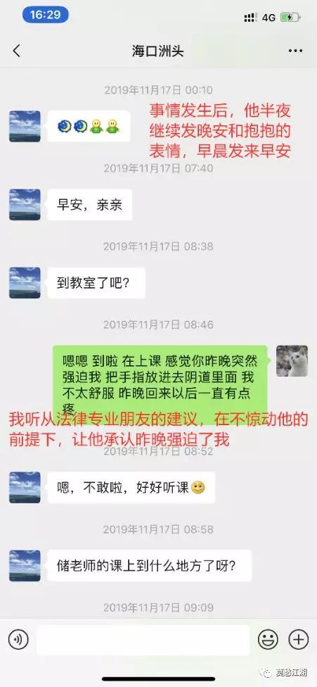 周日早晨,钱教授还像往常一样发来微信“早安,亲亲”,好像什么都没有发生过,而我已经是一夜未眠,强撑着打起精神来到教室上课。听从朋友们的建议,我回复说“你昨晚突然强迫我,把手指放进**(下体)里面,我不太舒服,昨晚回来以后一直有点疼。”我的态度让他以为我还会继续顺从,直接回复说:“嗯,不敢啦,好好听课”。