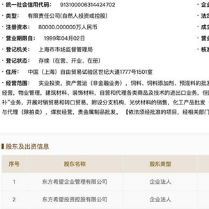 东方希望铝业有限公司成立于2012年12月21日,注册资本10亿元,经营范围包括铝锭、铝材、多晶硅、光伏材料的批发和进出口,并提供相关配套服务,投资管理。从股权结构来看,目前东方希望的股东分别为ORIENSSPESLIMITED、成都习术贸易有限公司、东方希望企业管理有限公司,持股比例分别为99%、0.99%、0.01%,认缴出资额分别为9.9亿元、990万元、10万元。