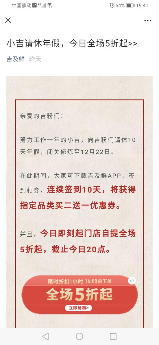 另一位用户则表示,今天(11号)是清仓,不知道是不是要换老板了。吉及鲜公众号在宣布暂停营业的同时,还打出了当天剩余时间“全场5折起”的促销口号。