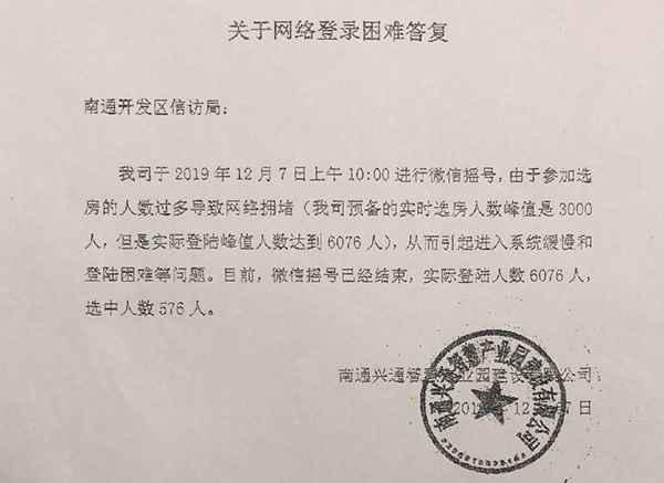 开发商答复南通开发区管委会,网络登陆困难,系因人数过多。
