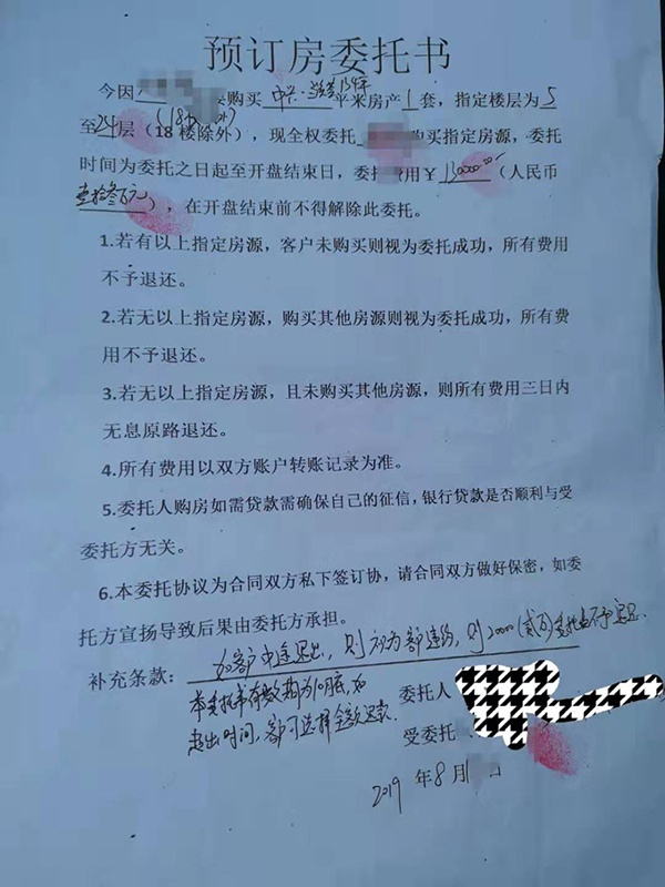 澎湃新闻拿到的四份“预定房委托书”显示,这一费用名义为“服务费”或“中介费”,费用9万到18万不等,签订日期最早在今年5月份。