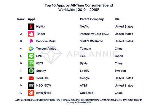 在App收入上,Netflix、Pandora Music和腾讯视频位列前三,另外爱奇艺视频和快手也上榜了。