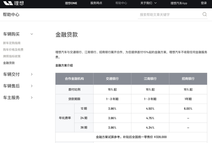 理想汽车的官方网站显示,目前交通银行、江南银行和招商银行三家银行是理想汽车的金融贷款合作方,其中江南银行的利率稍高,招商银行则仅提供12期贷款。